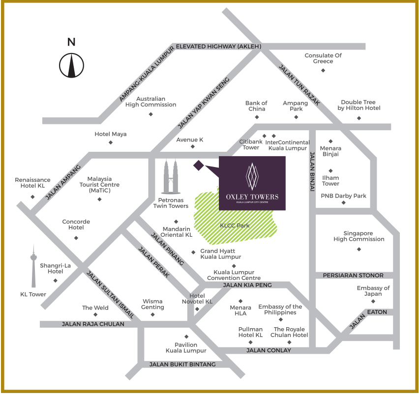 项目距离吉隆坡地标性建筑双子塔仅约250米步行距离,同时与占地50英亩、绿意环绕的KLCC城中城中央公园无缝连接,享有城市绿肺与繁华都市的双重资源,是市中心罕有的优质生态住宅选址。